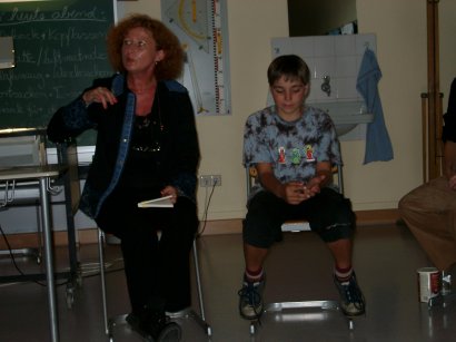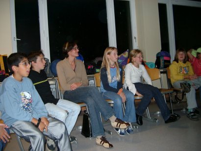 Die Schüler der 5a waren total begeistert und beschlossen, im Rahmen des Deutschunterrichtes an der Fortsetzung der monatlichen Geschichte aktiv mitzumachen. Dies passt natürlich auch hervorragend in die Arbeitsweise der beiden jungen Referendare in dieser Klasse, denn deren Schwerpunktarbeit soll in diesem Schuljahr auf der Sprachförderung liegen, einem Projekt, welches vom Seminar Nürtingen in Zusammenarbeit mit der PH Schwäbisch Gmünd erprobt wird. Dies alles unter dem Aspekt "PISA"! Ganz besonders faszinierte die Jugendlichen, dass die drei Kinder , die in Astrid Nagels Büchern die Hauptrolle spielen, nun auch in ihren Fortsetzungsgeschichten den Ton angeben dürfen. Mit viel Applaus wurde die Autorin verabschiedet, die zum Schluss noch auf ihr neuestes Buch hinwies, welches extra für die Weihnachtszeit geschrieben wurde und im Oktober auf den Markt kommt. Spannung ist bereits vorprogrammiert. Die Nacht der Klasse 5a war nun noch nicht zu Ende, es gab noch weitere Überraschungen und vor allem wurde gemeinsam im neuen Klassenzimmer übernachtet. Das war wirklich ein toller Start ins neue Schuljahr! Da waren sich alle einig. |