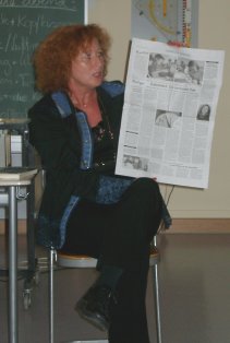 Frau Nagel stellte zuerst eines ihrer Bücher "Verschollen in Antania" vor und anschließend erzählte sie von dem Projekt mit der SÜDWEST PRESSE, an dem auch die Jugendlichen in Kirchheim teilnehmen können. Monatlich erscheint eine Fortsetzung der Geschichte "Die verlorene Zeit", die jedoch nicht allein aus der Feder der Autorin kommt, sondern vielmehr von schreibfreudigen Jugendlichen. Eine Jury wählt monatlich die spannendste Fortführung unter allen einsendenden Jugendlichen aus, und diese wird in der Zeitung veröffentlicht. Dann ergänzt die Autorin die Geschichte und wieder geht es weiter und jeder kann sich mit seinen eigenen Ideen beteiligen. Tolle Preise locken! |