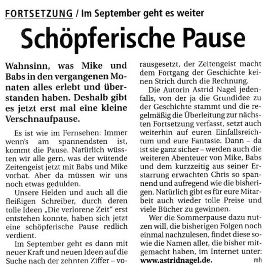 Die verlorene Zeit - Fantasygeschichte zum Mitschreiben für junge Nachwuchsautoren - Eine Aktion der SÜDWEST PRESSE und Astrid Nagel --- Pressemitteilungen